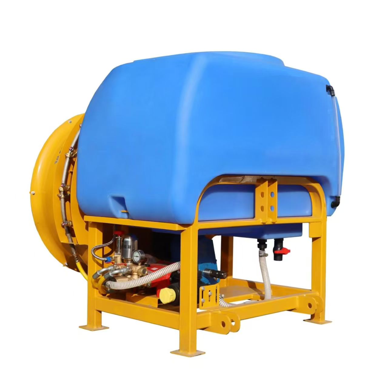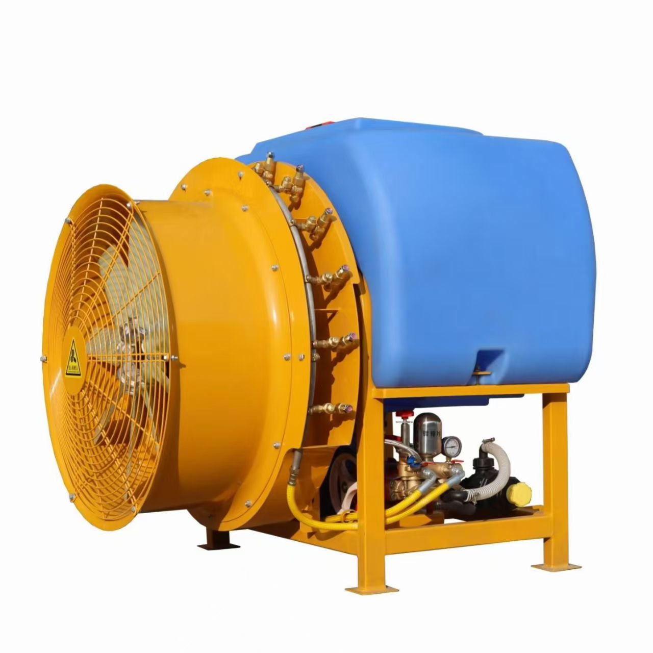 - مكونات الرش الأساسية: مجهزة بمراوح طرد مركزي عالية الضغط (تدفق هواء يصل إلى 8,000-12,000 متر مكعب/ساعة)، وخزانات بولي إيثيلين مقاومة للتآكل (سعة 500-1000 لتر)، وفوهات نحاسية قابلة للتعديل. تولد المروحة دفعات هوائية قوية لحمل القطرات، مما يضمن تغطية متساوية على جانبي الأوراق.