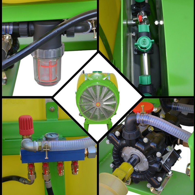 - المكونات الأساسية: مضخة غشاء عالية الضغط (مقاومة للتآكل، متانة عالية)، إطار ربط ثلاثي النقاط (متوافق مع معظم موديلات الجرارات)، نظام أنابيب هواء قابل للتعديل (مع مروحة عالية السرعة)، مجموعة فوهة دقيقة (مضادة للانسداد، زاوية رش قابلة للتعديل)، خزان كيميائي كبير السعة (300-800 لتر، مادة PE صالحة للطعام)، ولوحة تحكم ذكية (لتنظيم التدفق والضغط).