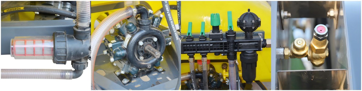 تقوم المضخة بضغط السائل الذي يتدفق عبر الخراطيم إلى فوهات الرش. تعمل هذه الفوهات على تفتيت السائل إلى قطرات دقيقة، مما يسمح لآلة الرش اللاحقة بتغطية المحاصيل/البساتين بالتساوي في تمريرة واحدة.